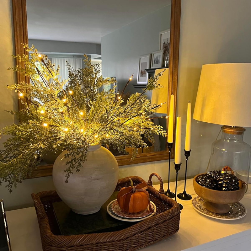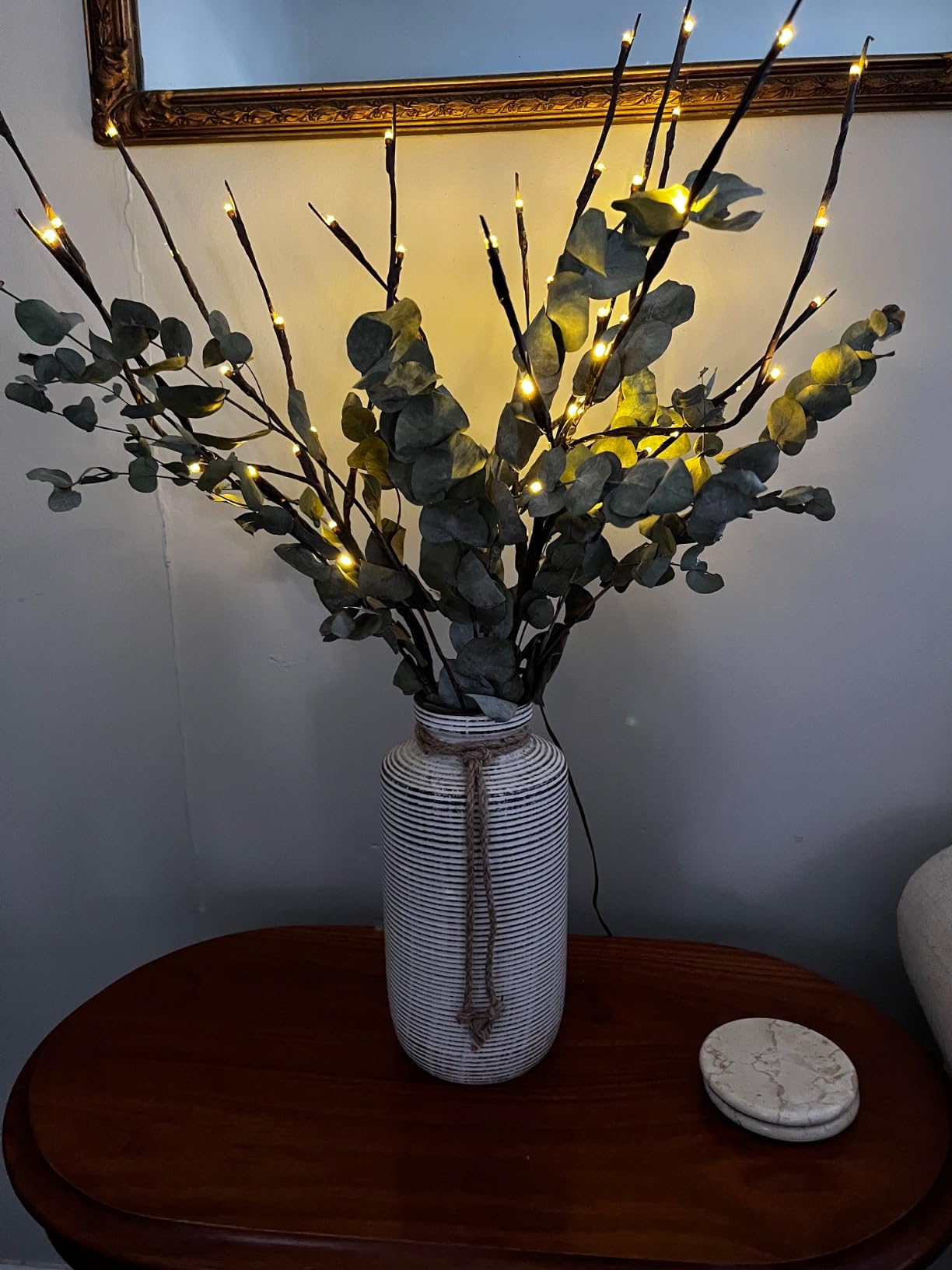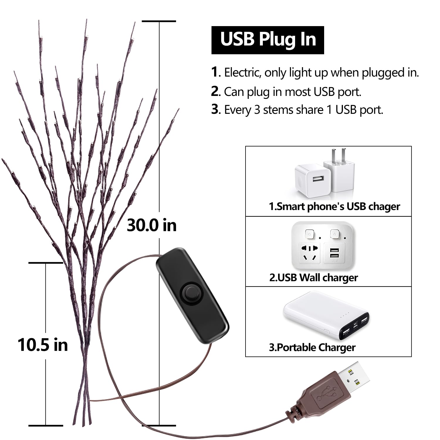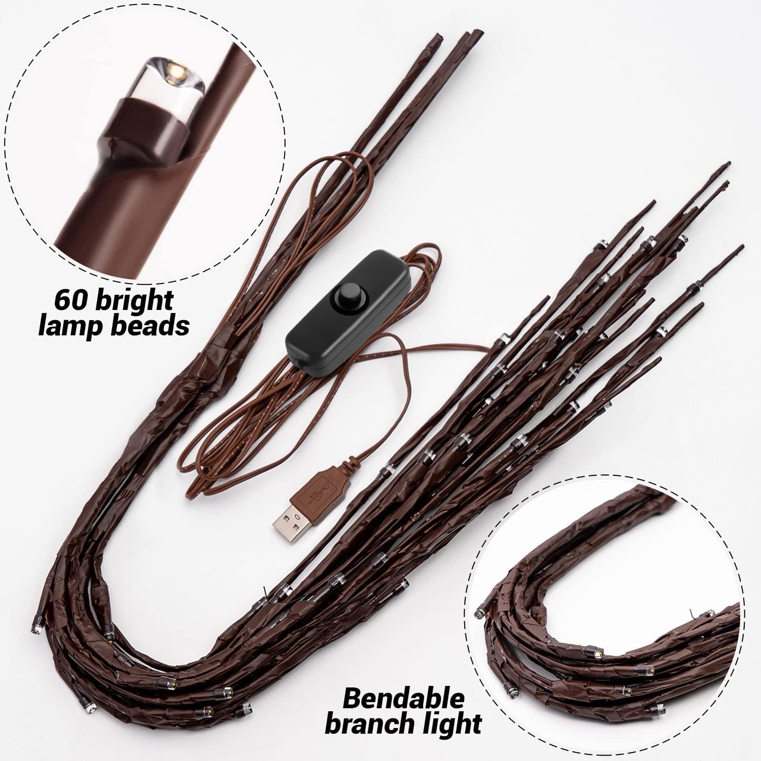 Each decorative willow twig lights comes with 5 bendable stems, 27.6 inches total length, and 20 led warm white light bulbs. 2 packs of branch lights together to make the foliage look more lush.